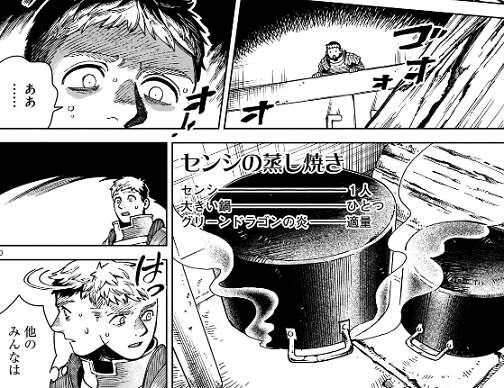 ライオスの所に襲ってきたグリーンドラゴンは機敏な竜で、逃げても逃げ切れませんが、金銀財宝に執着する性質があるとライオスは解説し、銀食器で気をそらそうとします。しかし、グリーンドラゴンは純銀のスプーンには目もくれずセンシを追いかけます。追い詰められたセンシは鍋の中に逃げ込みますが、グリーンドラゴンが炎を吐きセンシは大きい鍋の中で蒸し焼きになってしまいます。料理のように、センシの蒸し焼き、と解説がついています。
