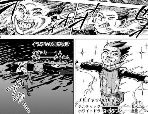 しかし、逃げた先で下からリヴァイアサンに襲われ水に落とされてしまい、イヅツミは溺れてしまいます。水は何故か海水でしたが、何とか泳いでチルチャックは助かります。が、その先にはホワイトドラゴンがいて、チルチャックはブレスをかけられてしまいます。