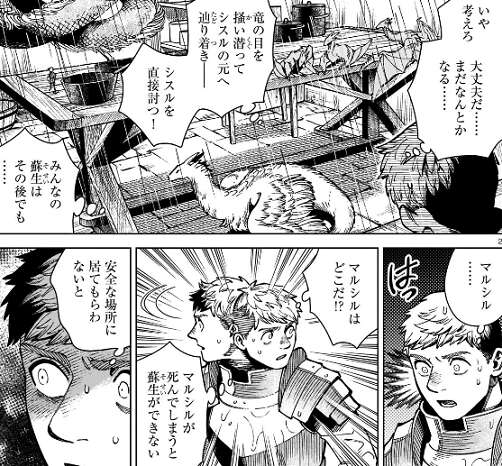 チルチャックとイヅツミがリヴァイアサンやホワイトドラゴンに襲われているのを見て、ライオスは生き物というより災害だ、と諦めかけます。しかし、竜の目を掻い潜ってシスルの元へ行き、シスルを直接討てばなんとかなる、とライオスは望みを捨てません。ただ、マルシルが死んでしまうとみんなの蘇生ができないと、マルシルは安全な場所にいるか確認します。