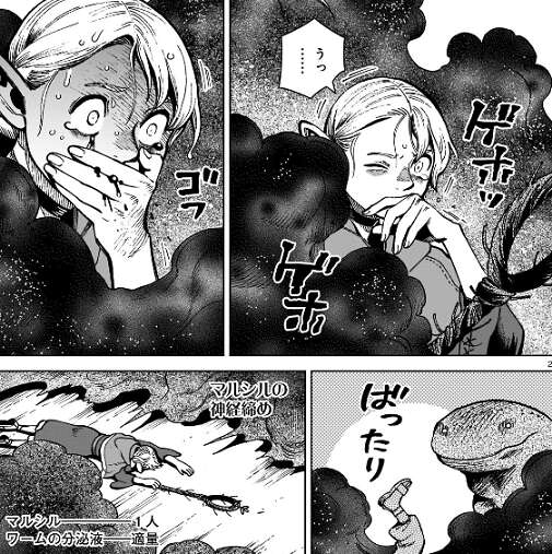 マルシルはワームに襲われていて、爆発呪文を連発していました。ワームは目がほとんど退化しているので、音を立てないように爆発呪文を唱えるな、とライオスは叫びます。しかし、ワームに有毒なガスを吐かれてマルシルは毒にやられて、倒れてしまいます。マルシルの神経締め、としてここでも料理のように解説がつきます。