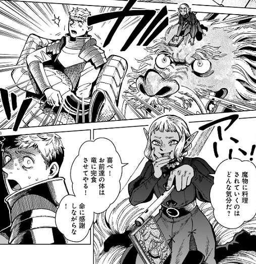 仲間がどんどん竜達に料理されていき、さらに自分も東洋龍に捕まってしまいます。シスルに、喜べ!お前達の体は竜に完食させてやる!命に感謝しながらな!と、笑いながら言われます。ライオスは、あんまりだ、こんな形で全てが終わるのか、と絶望してしまいます。