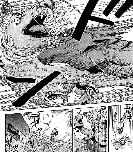 しかし、ライオスが東洋龍に食われる寸前、東洋龍は別の竜に体当たりされて、食われずにすみます。竜同士が争っているのを見て、伝説だろうが、災害だろうが、竜は生き物なんだ!!とライオスは冷静になり、あらためて対処しようとします。