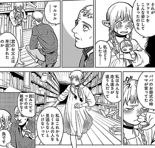 今回の話で、マルシルがエルフとトールマンのハーフという事が判明しました。6巻の42話でマルシルが父親の葬式の時に、私はみんなと走る速さが違うんだって、私はこれからもたくさんの人を見送らないといけないって、と母親から言われていたのを思い出しました。みんなと走る速さが違うと言っても、マルシルと同じエルフなら同じ寿命じゃないの?と思っていましたが、エルフとトールマンのハーフだとエルフを凌ぐ長寿になるみたいですね。だからエルフともトールマンとも、走る速さ=寿命が違うってことですね。