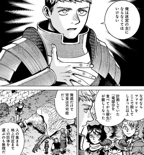 67話でファリンを殺してしまったライオスは迷宮の主になることを決意し、皆に今後の作戦を説明します。迷宮の主になれば迷宮を自在に操れて、ダンジョンの深層部分に当たる現在地を地上付近にまで移動し、ファリンの巨体を移動することも簡単です。