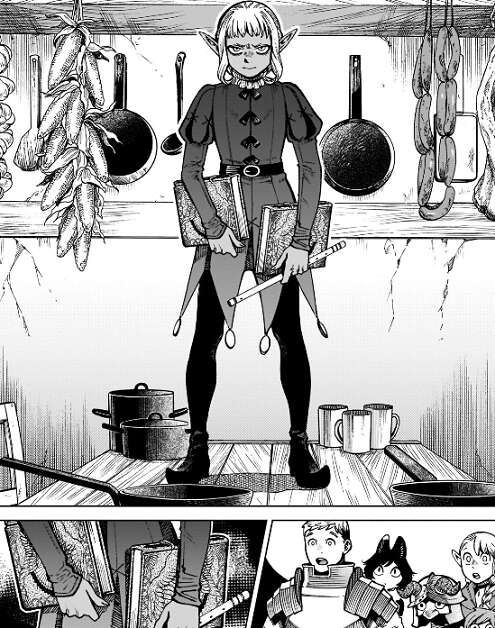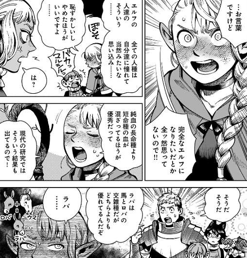 マルシルはシスルに長命種と短命種の混血は生物としては完全な失敗作だ、と言われ怒りながら完全なエルフになりたいだとか、全然思っていないと否定します。マルシルは、現代の研究では、純潔の長命種より短命種の血が混じっている方が優秀だという結果も出ていると言います。ライオスはラバを例に出し、馬とロバの交雑種だがどちらよりも優れてるとマルシルを擁護します、がマルシルは複雑な顔をします。