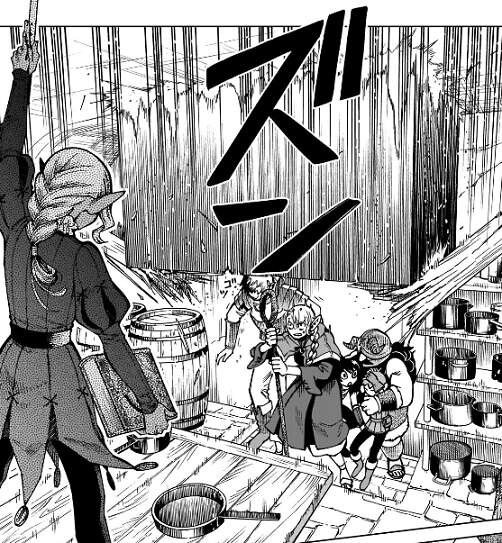 再び自分の竜を殺し、さらに魔物達を殺し料理して食い、さらに家を荒らした事にシスルは激怒します。シスルは家の天井を操作しライオス達をすり潰そうとしますが、マルシルが魔法で防いでくれたのか、天井は途中で止まりライオス達は何とか助かります、ライオス一人だけ頭をぶつけてしまっていますが。