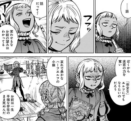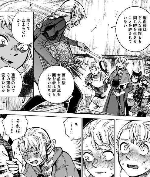 しかし、シスルは混血の方が短命種より丈夫で、エルフを凌ぐ長寿であることは知っていると言い、しかし寿命や成長速度が不安定で子供を成すことが出来ない欠点があると指摘します。そして、混血種はどんな種族とも同じ時を生きれない、百年後マルシルと食卓を囲む者はいないだろう、と言い迷宮の力でその運命を変えたいか、とマルシルに質問します。マルシルは複雑な表情をして、否定しようとしますが完全には否定できずにいます。