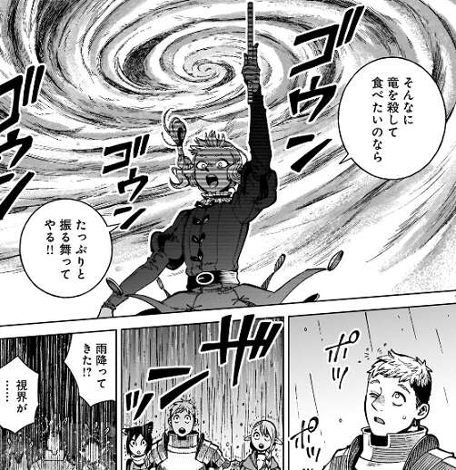 シスルはマルシルの欲望には興味はない、と切り捨て手に持った棒を振ると家が揺れ始め、気が付くと台所全体が巨大化しています。さらにシスルは天候を操作すると、雨が降ってきて視界が悪くなります。
