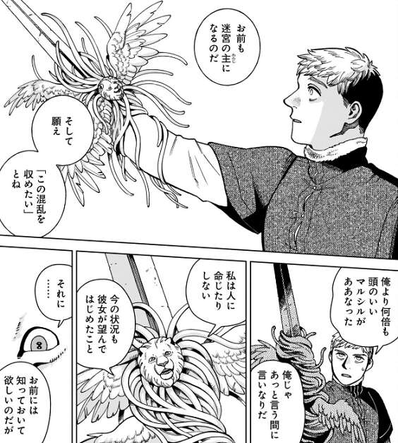 翼獅子はライオスに、迷宮の主になってこの混乱を収めたいと願え、と要求しますが、自分より何倍も頭のいいマルシルがああなったから、俺じゃああっと言う間に言いなりだ、とライオスは翼獅子の要求を拒否します。