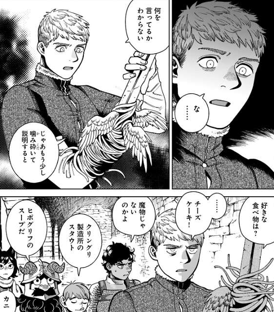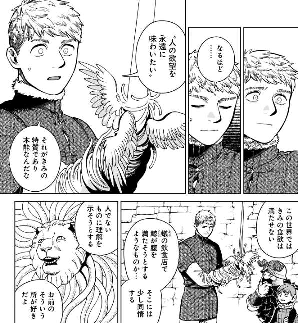 翼獅子の話を聞いて、チルチャックは戸惑い、センシは冒涜だと怒ります。ライオスは、“人の欲望を永遠に味わいたい”という事が翼獅子の特質であり本能なんだな、と翼獅子を理解しようとし、翼獅子も人でないものに理解を示そうとするライオスに好感を抱きます。