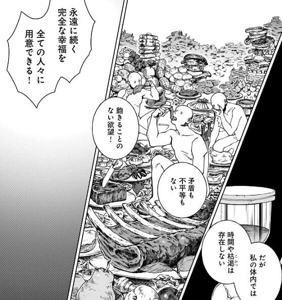 翼獅子は好物をひと口含む瞬間を想像しろと言い、どんな食物も食べればなくなってしまうように、人生の幸福の頂点は一瞬だと言います。だが私の体内では時間や枯渇は存在しない、矛盾も不平等もない、飽きることのない欲望、永遠に続く完全な幸福を全ての人々に用意できる!と、翼獅子はライオス達に断言します。