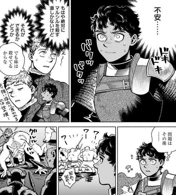 ナマリはライオスに、マルシルを正気に戻してこい、と言うと魔物を足止めに向かいます。残されたライオス達はマルシルを正気に戻す方法を考えますが、悪魔がマルシルを守っているので、良い方法が思いつかず全員で悩みます。