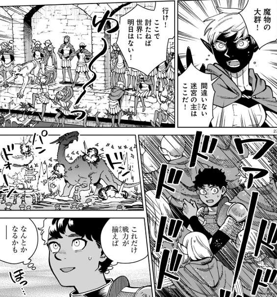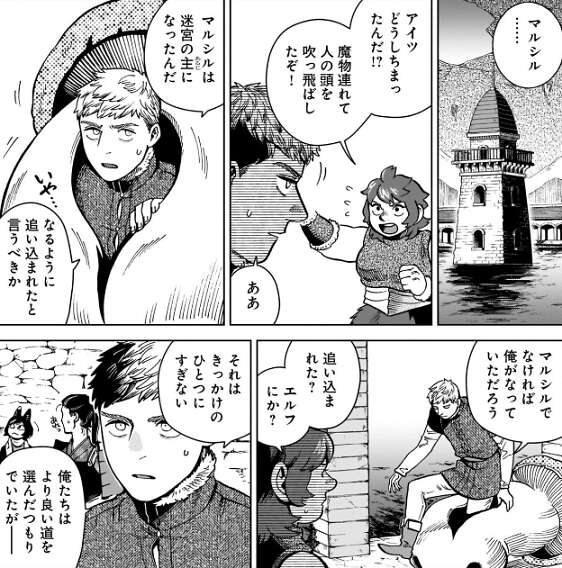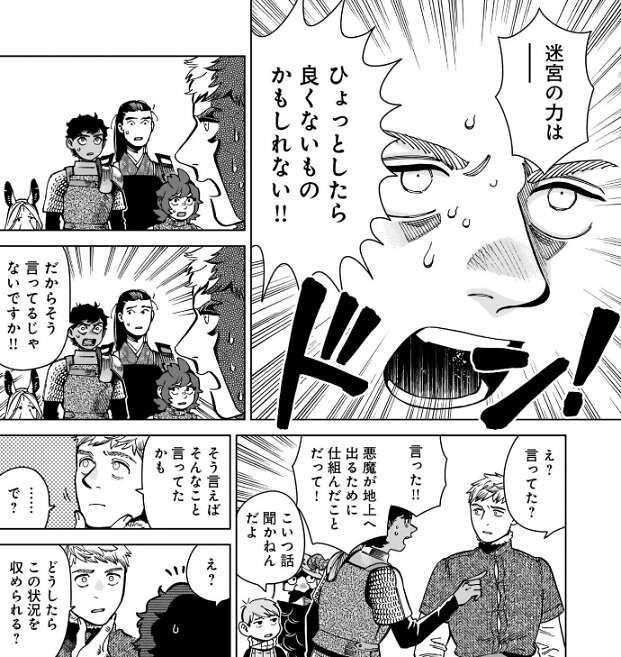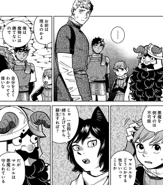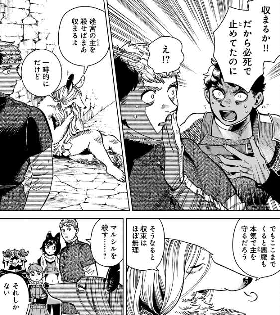 ライオスはカブルーにどうしたらマルシルを翼獅子から引き離し、魔物を止めて迷宮を元に戻せるか、方法を聞きますが、カブルーは収める方法がないから必死で止めていた、と激怒します。リシオンは、マルシルを殺せば一時的に状況は収まると言いますが、悪魔も本気でマルシルを守るだろうから、そうなったら事態の収束はほぼ無理だと言います。その話を聞き、ライオスはどうやったら悪魔を倒せるのか、皆に聞きます。