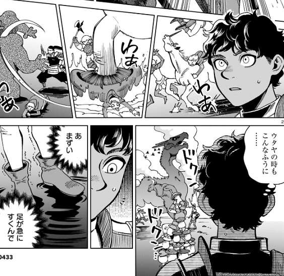 しかし、ミノタウロスのような強力な魔物も現れ始め、冒険者達は徐々に怯みはじめます。さらに冒険者の中には戦意喪失し、魔物との戦いを放棄する者も現れ始め、魔物の群れに徐々に押され始めます。カブルーはウタヤの時を思い出し、足が急にすくんでしまいますが、そこにレッドドラゴンが現れカブルーは絶体絶命のピンチに陥ります。
