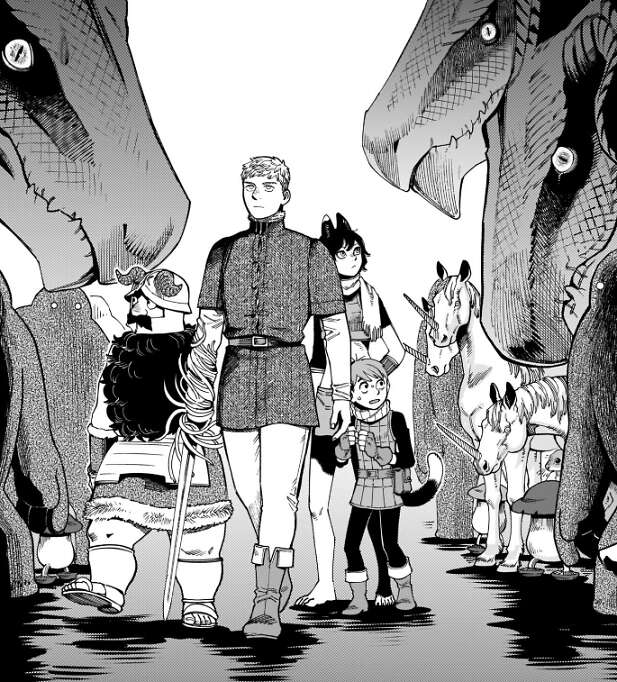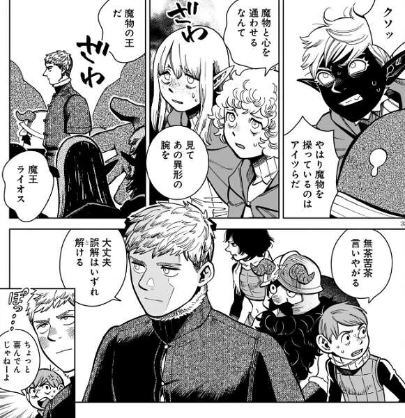 魔物に守られているライオス達を見たカナリア隊の面々は、ライオスを魔王の王、魔王ライオスと呼び、恐れます。ライオスはチルチャックに、大丈夫、誤解はいずれ解ける、と言い聞かせますが、魔物の王、魔王ライオスと言われて少し喜んでいて、それをチルチャックにツッコまれます。