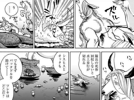ユニコーンに背中を刺されてしまい、リシオンは身動きが取れないほどの重傷を負ってしまいます。カナリア隊の他の仲間を助けようとも考えます。しかし、既に自分達が全滅状態であると分かりリシオンは死を覚悟します。