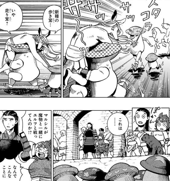 そこに歩き茸がリシオンとユニコーンの間に割って入り、リシオンを担いで救出し、そのまま走って逃げていきます。通路の所にはナマリとシュロー、オーク達が到着していましたが、彼らの所に歩き茸達は走っていきます。