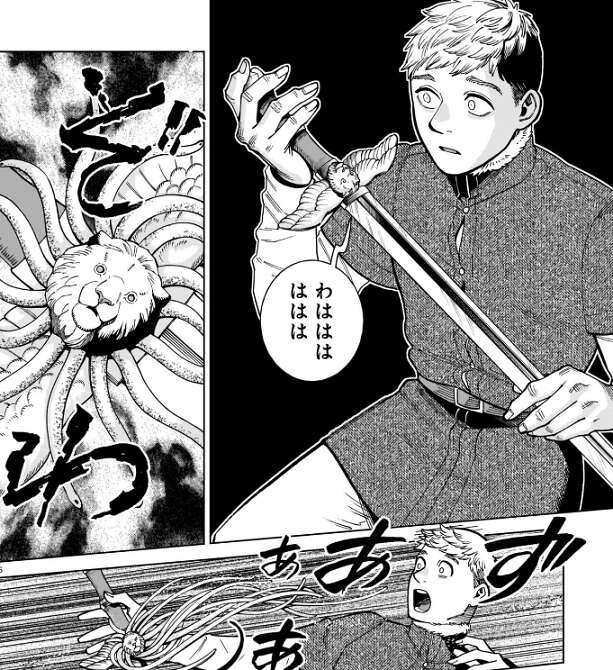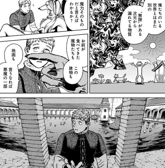 するとリシオンは、悪魔は生き物ではなくこの世界とはまた別の、“無限”がある次元から漏れている物質、魔力そのもので、魔物たちも、建物も、地面も、言うなれば悪魔の一部だ、とライオスに言います。そして、それを倒したいってんなら、まあ頑張れ、とリシオンはライオスに言うと、リシオンは仲間の死体を回収しに向かいます。