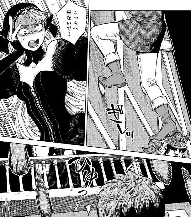 そんな話をライオス達がしていると、バルコニーのような場所からマルシルが話しかけてきます。ライオス達がいる場所より大分上の方にいて、ライオス達はマルシルの所まで登っていく方法が分かりません。マルシルの頭の中には次から次に欲しいもの、やりたことが溢れているようで、今マルシルはライオス達の相手が出来ないようです。