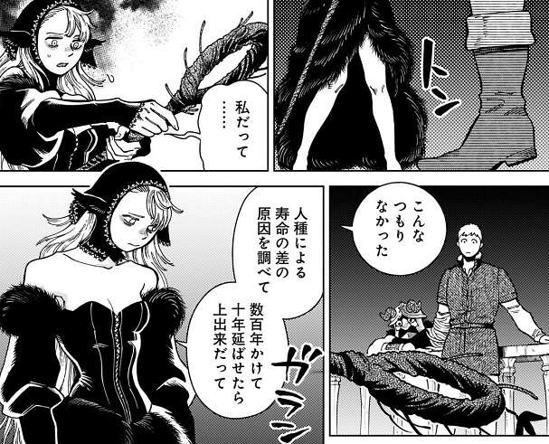 その直後、マルシルは叫ぶのを止めて、こんなつもりなかった、人種による寿命の佐野原因を調べて、数百年かけて十年延ばせたら上出来だって、とマルシルは元々考えていた考えをライオスに話します。