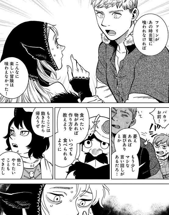マルシルの話を聞き、ライオスは今までの旅で色んな物を食べたことを話し、この度の最初の切欠、ファリンがあの時レッドドラゴンに喰われなければ、こんなに楽しい冒険は味わえなかった!と、断言します。しかし、チルチャックから言い方を注意され、もう少しマシな言い回しがあるだろう!と、ライオスは怒られます。センシは食べたいものがあれば作り方を教えよう、と言い、イヅツミはもうここは飽きたから帰ろうぜ、とマルシルに言います。