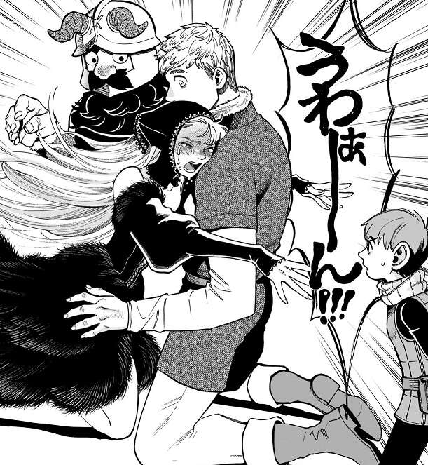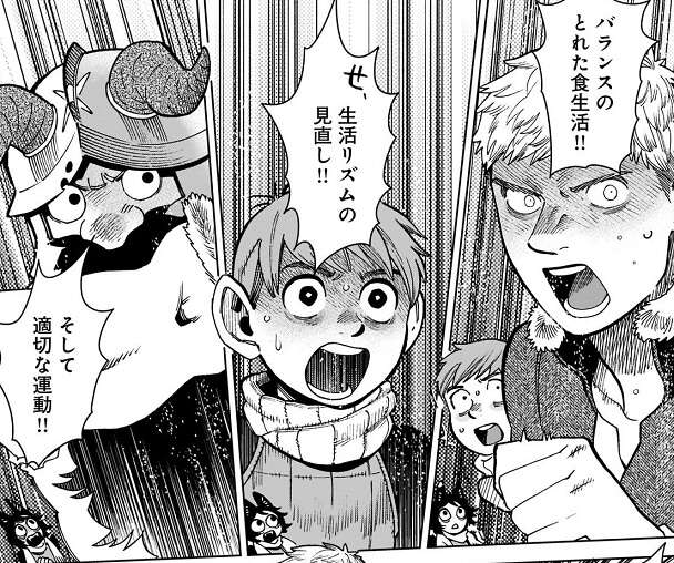 マルシルは元々は数百年かけて十年、寿命を延ばせたら上出来だと考えていたようで、こんな地上の全てを巻き込んで全ての種族の寿命を同じにするつもりではなかった事を思い出したようです。そして今回の旅の最初の方のセンシの決め台詞で、初心を思い出したのか、もしくは吹っ切れるきっかけになったのか、マルシルは号泣して仲間の所に戻ってきました。しかし1巻のセンシの決め台詞を言っていた頃にイヅツミはまだいないので、なぜ三人がそこまで食生活、生活リズム、適切な運動について熱弁しているのか理解できないようで、かなりドン引きしています。