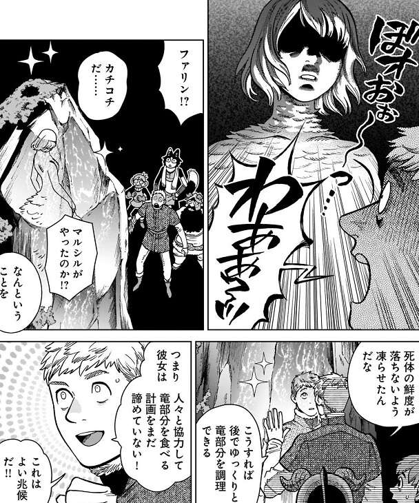 ライオス達はマルシルを説得する為に建物の中へ入っていきますが、建物の中は真っ暗で予想以上に寒くなっていました。ライオスが魔法で明かりをつけると、そこには凍らされたファリンがいました。凍らされファリンを見たライオスは、まだマルシルが人々と協力して竜部分を食べる計画を諦めていないと思い、よい兆候だとポジティブにとらえまだ対話の余地があるとチルチャック達に言います。しかし、アレを見た後でまだ対話で解決できると思っているライオスに、チルチャックはあきれます。