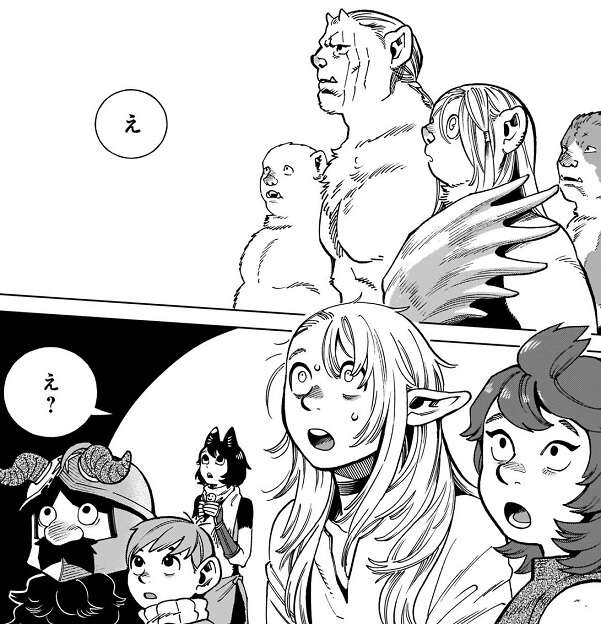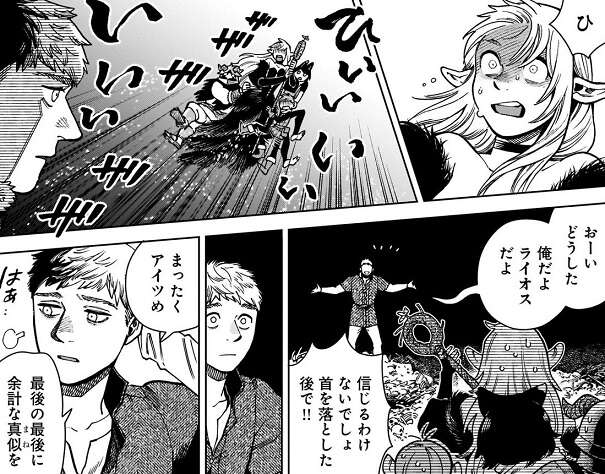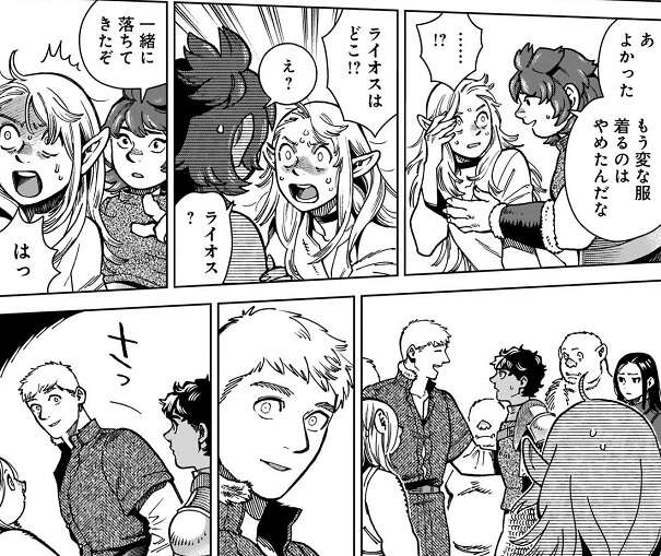 前回、ライオスの体に入った翼獅子は、マルシル達の前で首を繋げなおしてみせました。その異様な様子にマルシル達はドン引きし、後ずさりしますが、ライオスの体に入った翼獅子は、ライオスだよ、と言いごまかそうとします。どうやら、ライオスの体は翼獅子に完全に乗っ取られてしまったようです。