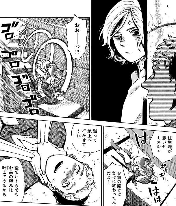 しかし、翼獅子が塔の階段を上っていた先にはミスルンが待ち伏せしていて、ライオスの体に入った翼獅子を押し倒し、翼獅子を地上に行かせないようにします。翼獅子はミスルンに、黙って地上に行かせてくれ、後でいくらでもお前の望みは叶えてやるから、と言いますが、ミスルンは聞く耳を持たずライオスの首を絞め続けます。