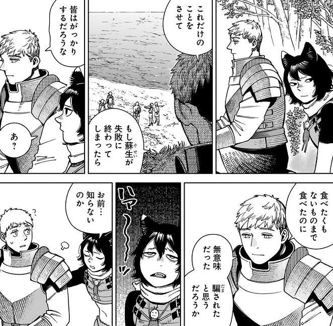 イヅツミはライオスの下に行くと、料理の話を振ります。ライオスは骨や皮をどうするかを考えていて、出来るだけ出汁を取った後、細かく砕き熱を通して森に撒こうと考えていました。そして、これだけのことをさせて、もしファリンの蘇生が失敗に終わったら、皆は食べたくないものを食べたのに、無意味だった、騙されたと思うだろうか、と心配していました。しかしイヅツミはライオスに、食べたくもないものを食べないといけない日は誰にでもあるんだ…、と慰めます。そして、たまに思い通りの飯が食えなくても大丈夫だろう、食べる食べないは選んだんだから、とイヅツミはライオスに言い、本当にムカつくのは選ぶことすら出来ない事だ、と今の心境を語ります。