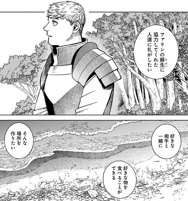 この先どうするのか?と、イヅツミがライオスに聞くと、ファリンの蘇生に協力してくれた人達に礼がしたい、とライオスはしたい事を話します。好きな相手と一緒に、好きな物を食べることができるような場所を作りたい、とライオスは夢を語り、妹・ファリンの蘇生が上手くいかなかったとしてもやれることをやる、とライオスはイヅツミに言います。