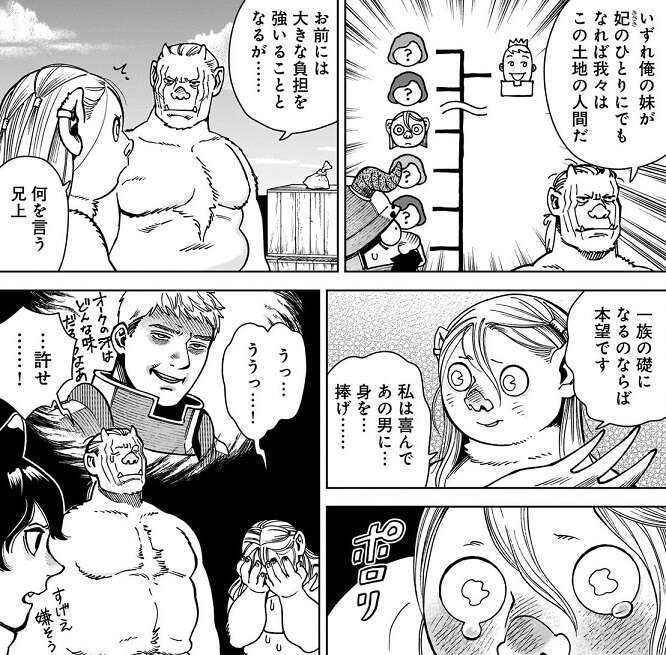 それはライオスが島の王になることです。センシは島の人間が認めるか疑問ですが、ゾンは島の外のドワーフやエルフが認めれば、今の島主が何と言おうとライオスが次の王になれると言います。そして、ゾンの妹・リドがライオスの未来の妃のひとりにでもなれば、オークもこの土地の人間だと言います。リドはライオスの妃になるのはかなり嫌そうですが、一族の礎になるのならば本望です、と涙をのんでライオスに身を捧げるつもりのようです。そんな訳でゾンはセンシにライオスへの口添えをして欲しいので、センシを説得し始めます。ライオスが島の王になれば、センシもこの島でひとり食事を楽しめそうですが、センシはどうするでしょうか?