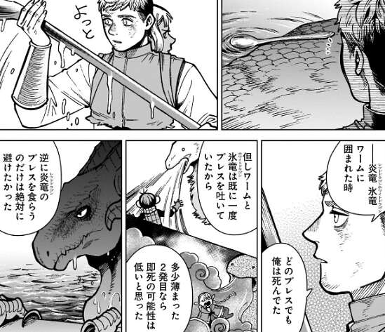 竜同士が争いを始めたおかげでライオスは何とか助かりますが、竜同士の争いに巻き込まれ竜の尻尾の下敷きになってしまいます。何とか逃げ出しますが、肋骨が折れてしまい下敷きになった衝撃で着ている鎧もダメになってしまいます。竜達の争いを観察しつつ、ライオスはこのまま竜同士が潰しあってくれることを期待しますが、シスルは竜達に争いを止めるように命令します。