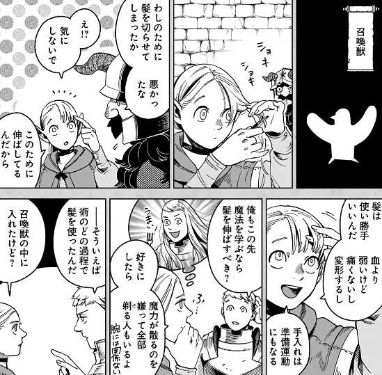 召喚獣の話では、マルシルが召喚獣を作った時に、召喚獣に自分の髪の毛を使った話から、ライオスが自分も髪を伸ばした方がいいのかと言う話になります。魔力が散るのを嫌って全部、剃る人もいるそうで、魔力の腕とは関係ないようです。そして召喚獣の中に髪の毛を入れましたが、その召喚獣は食材として使われたのでネコ科の動物が混じっているイヅツミは、猫と同じ習性がでてしまいます。