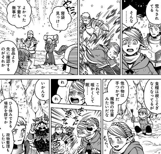 ライオス達は以前、レッドドラゴンと戦い全滅した場所に辿り着きます。ここは長らく迷宮の最深部だと思われていましたが、この付近で奥へ続きそうな扉が発見され、ライオス達はその扉の文様を写しに、前回はここまで来ました。前回全滅したこの場所に道具が残っていないかライオス達が確認すると、荒らされてはいましたが食料以外は残っていました。