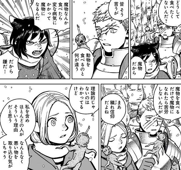 センシの過去については、センシはずっと自分の仲間を、もしかしたら食べていたかもしれないとトラウマになっていました。結局はセンシが食べた肉は違ったのですが、あの状況でグリフィンの肉を食べてみよう、と言えるライオスはいろんな意味ですごいです。