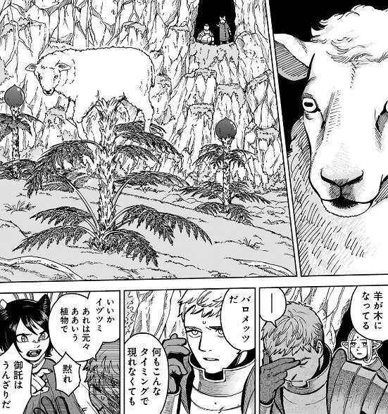 迷宮をしばらく進んだ後の夜営でも、もっと他にましなもんはないのか、とイヅツミは食事にわがままを言いだします。ライオスは、迷宮で食物の選り好みはできない、俺たちもずっと様々な物を食べてきたんだよ、と諭してもイヅツミは聞く耳を持たず気になっている羊を見つけると、捕まえてくると勝手に単独行動をします。