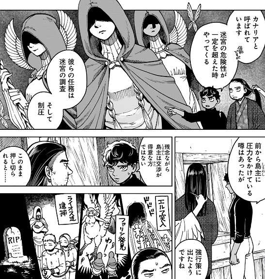 場面変わって、地上に転移の術で帰還したシュロー一行と、カブルー一行は島主への報告は明日にして、まずはゆっくりと休もうとします。しかし、島に西方エルフの船が来ている事を知ったカブルーは、すぐに島主に報告に行った方がいいとシュローに言います。カナリアと呼ばれる部隊が迷宮に突入し、西方エルフが制圧してしまえばライオス達は逮捕され、連行されるだろうとカブルーは予測します。