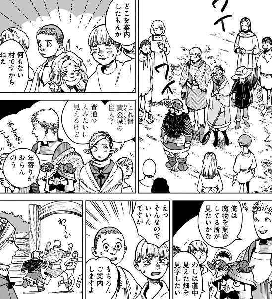 ずっとライオスが悪霊だと思っていた幽霊に連れていかれた先は、遠くに黄金城が見える村でした。その村では魔物が家畜の様に住人に飼われていて、魔物達も大人しく、住人に聞くと魔物達は住人を傷つけないように命令されているそうです。住人は会って欲しい人がいると言いライオス達を部屋へ案内します。その部屋にはデルガル王の孫、ヤアドがいて、黄金郷の事や、狂乱の魔術師 シスルの事を話し始めます。