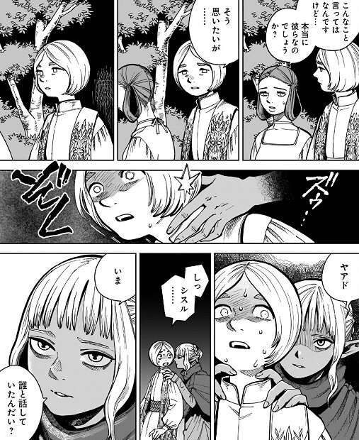 ヤアドに、有翼の獅子の予言にある通り狂乱の魔術師を倒し我々を解放して欲しい、と頼まれたライオスは、まずは最深部に囚われている有翼の獅子の力を借りるべく、再び迷宮に戻ります。ライオス達を見送るヤアド達ですが、その直後狂乱の魔術師 シスルが誰かと話していたのを察知したのか、村に戻ってきます。