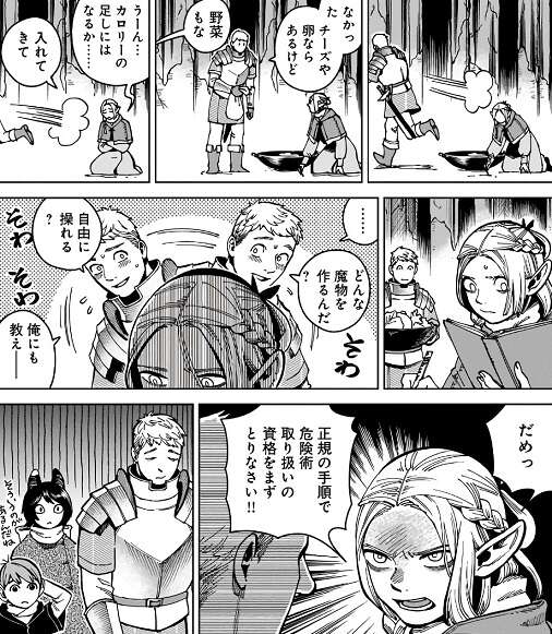 古代ドワーフの貯水庫でグリフィンに襲われ、連れ去られてしまったセンシを探そうと、マルシルは使い魔を召喚しようとします。これに魔物大好き ライオスが興味を示してしまい、マルシルがどんな使い魔を作るのか聞き出そうとしますが、マルシルに怒られてしまいます。