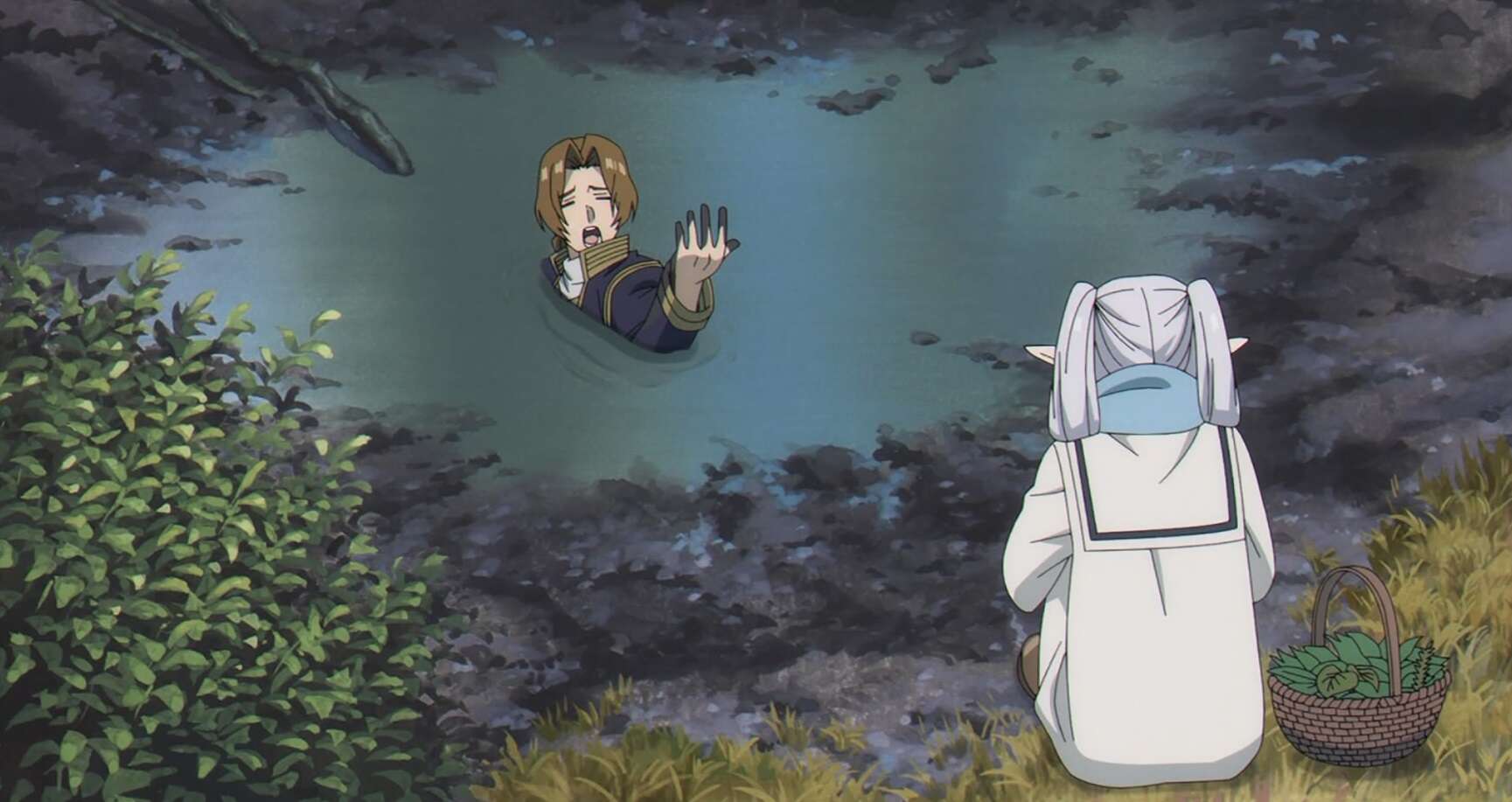 北側諸国アルト森林にて、フリーレンが薬草を取っていると男と遭遇します。男はフリーレンに昔話を話し続けますが、実は底なし沼にはまっていてピンチでした。男は手を差し出してフリーレンに助けを求めますが、フリーレンは男の手が(物理的に)汚いので助けるか悩んでしまいます。結局、フリーレンは時間をかけて“底なし沼から引っこ抜く魔法”を思い出し、フリーレンは男を助け出します。