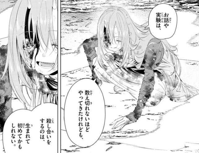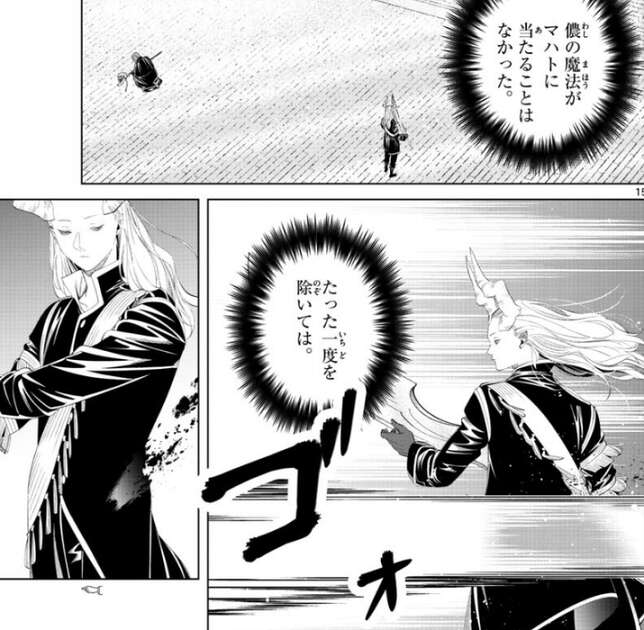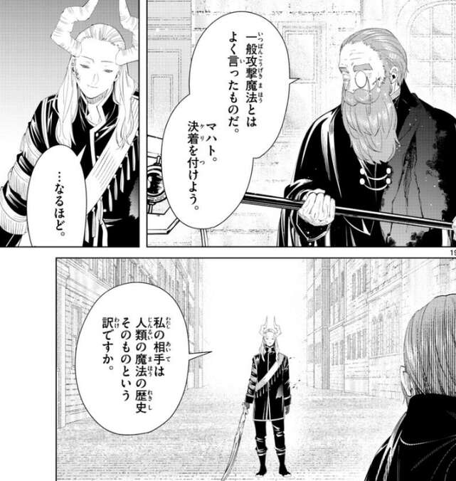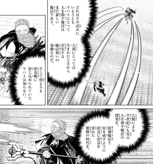 大きな実力差がありながらも、デンケンの人を殺す魔法(ゾルトラーク)がマハトに当たり始めデンケンは、ケリを付けよう、とマハトに話しかけます。マハトの知る人を殺す魔法(ゾルトラーク)とは最早別物と分かり、人類の魔法の歴史そのものが自分の相手なのだと、マハトは気付きます。