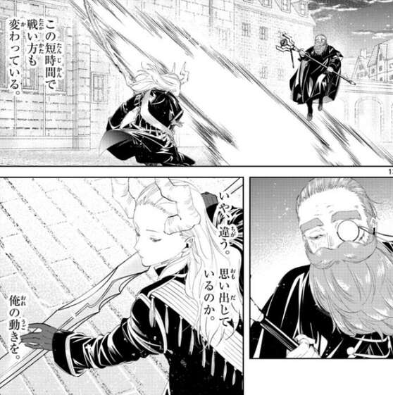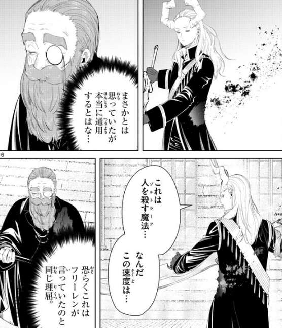 マハトはデンケンが使った人を殺す魔法(ゾルトラーク)の速度に驚いています。デンケンは一級魔法使い試験でフリーレンが言っていた事を思い出します。一般攻撃魔法(ゾルトラーク)は長命種にとっては比較的新しい魔法なので、反射神経で無意識に防御できるほどの年月は経っていない、だからほんの誤差のような時間だけれども、たった一瞬思考する分だけ対処が遅れる、とフリーレンはデンケンに助言していました。