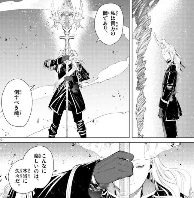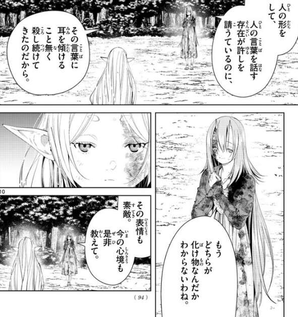 ソリテールの命乞いを聞き、そんな言葉は数え切れない程聞いている、とフリーレンが答えると、もう君の精神は人類のものとは掛け離れているわね、とソリテールは言います。命乞いの言葉に耳を傾けることなく殺し続けてきたのだから、もうどちらが化け物なんだか分からないわね、とソリテールが言うと、フリーレンは静かに怒りながら、これは会話じゃないな、と答えます。