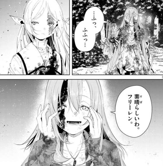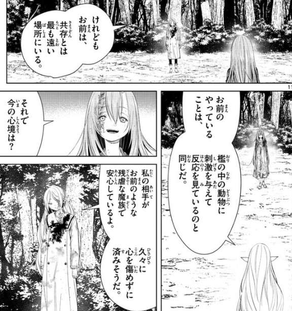 ソリテールは人類の心理をよく理解しているが、共存とは最も遠い場所にいる、ソリテールがしていることは、檻の中の動物に刺激を与えて反応を見ているのと同じだ、とフリーレンは言いますが、ソリテールは今の心境が知りたいようで、話の流れを無視して質問します。フリーレンは、お前のような残虐な魔族で安心する、久々に心を痛めずに済みそうだ、と言いソリテールに敵意を持ちます。