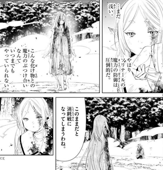 再びソリテールはフリーレンの魔力をぶつけるだけの攻撃をくらい吹き飛ばされますが、なおソリテールは笑いながらフリーレンを攻撃します。何度かの攻防が行われますが、ソリテールの魔力の防御は圧倒的で、ソリテールにはまだ余裕すらあるように見えます。