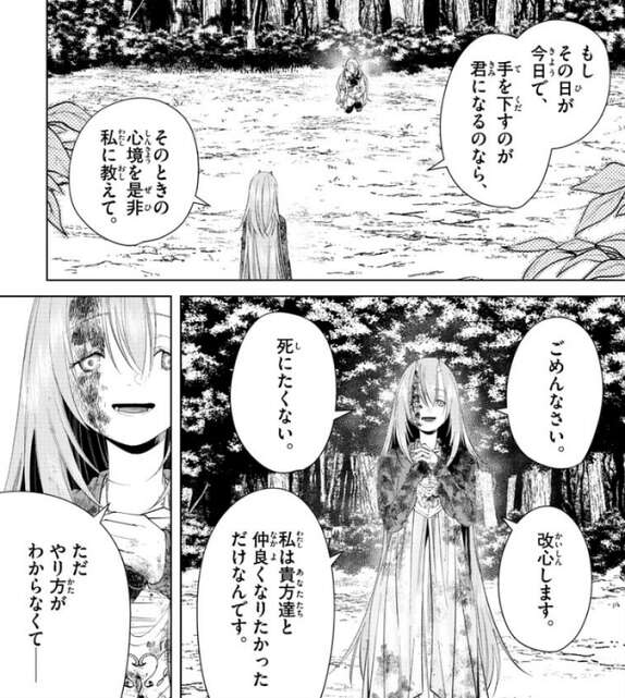 ソリテールはまたお喋りを始め、1つフリーレンに伝えておきたいことがあると言います。ソリテールは、人類に狩られる日が来ないと思っている程傲慢でないと言い、その日が来たら泣きながら命乞いをしようと考えている、とフリーレンに伝えます。そして、実際に命乞いをして見せて、フリーレンにその時の心境を教えて欲しいとお願いします。