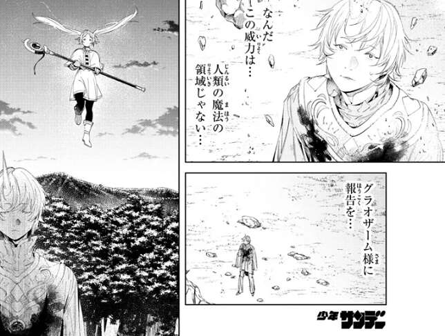 未来の魔法を使って一撃で岩の塊を破壊したフリーレンは、ツォルトを始末しようとすぐに移動します。一方、フリーレンの魔法の威力に、人類の魔法の領域じゃない…、とツォルトは驚き、七崩賢 奇跡のグラオザームにこの事を報告しようとします。