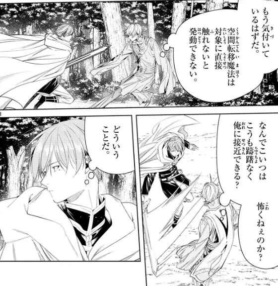 ツォルトはヒンメル達が躊躇なく接近して攻撃する様子を見て、直接触れられたら空間転移魔法が発動するのに怖くないのか?と、不審に思います。これはフリーレンの攻撃が的確な援護になって、ヒンメル達の攻撃をしやすくしているようで、まるで心を読まれているみたいだ、なんて君らしくない戦い方だ、とヒンメルは内心つぶやきます。